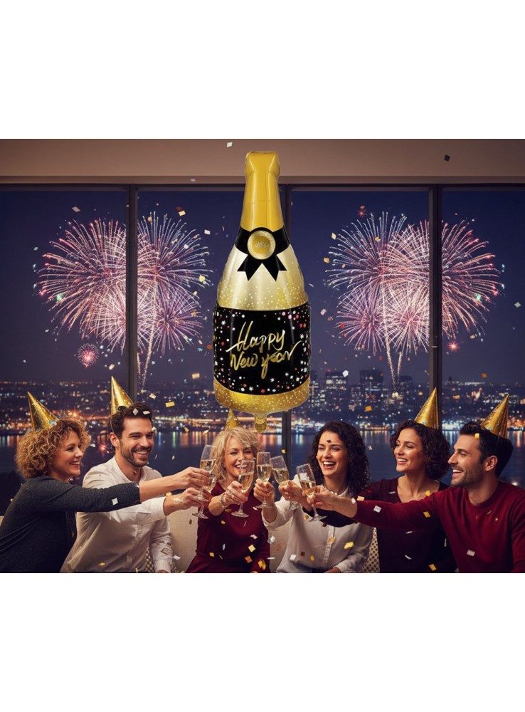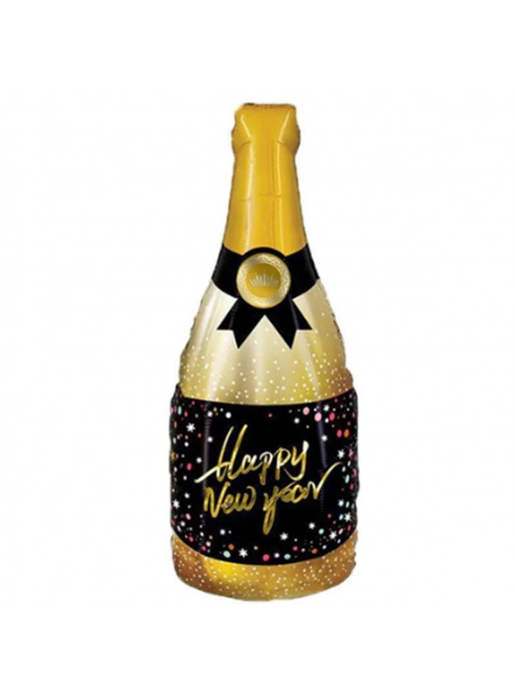 Balão Metalizado no formato de uma Garrafa de Champanhe com a escrita Happy New Year - Feliz Ano Novo.