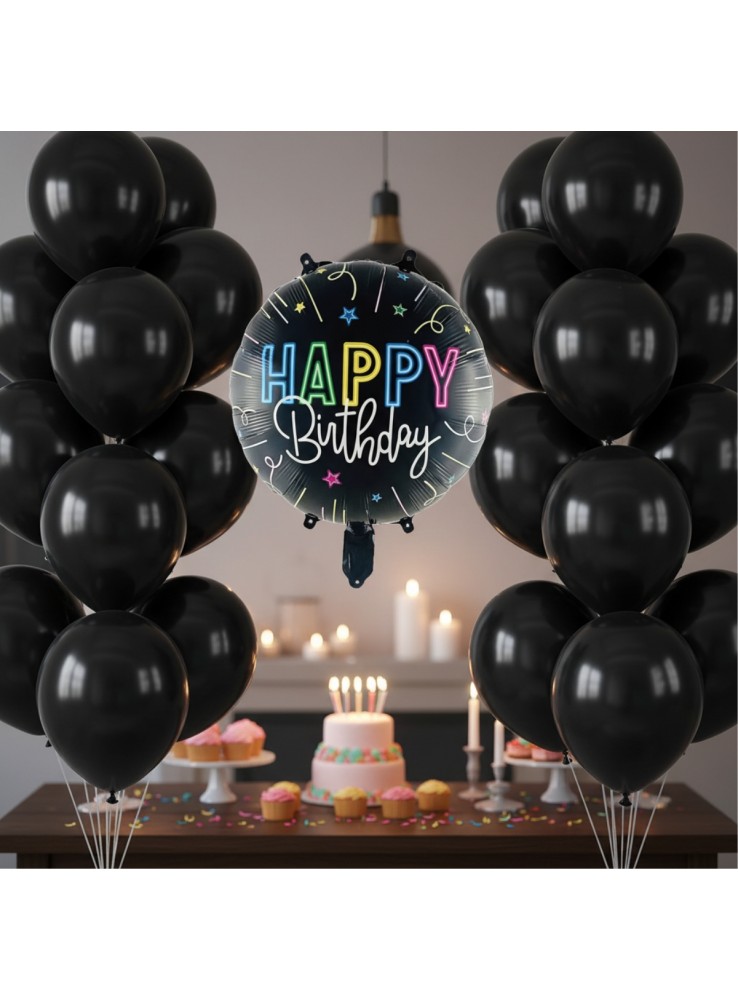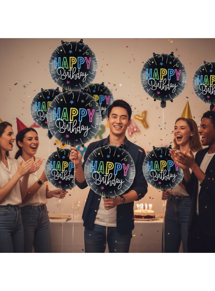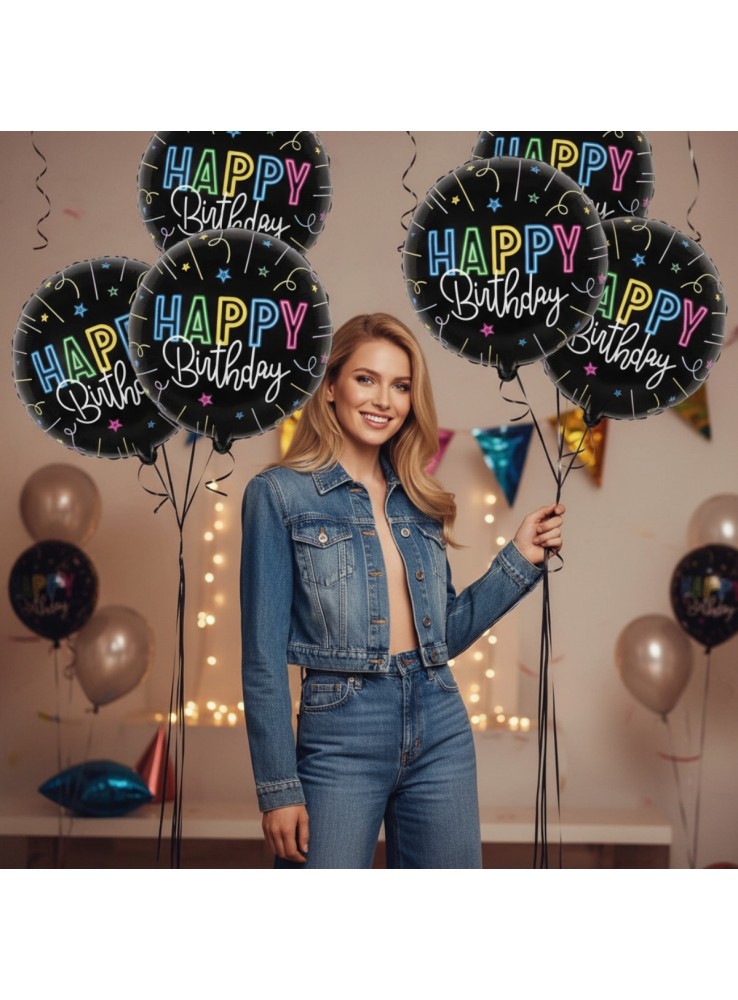 Balão Metalizado no formato Redondo no tema Happy Birthday (Feliz Aniversário) Preto com Letras Coloridas.