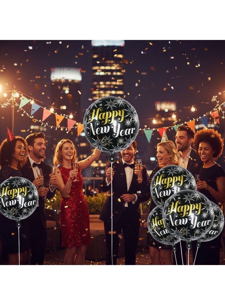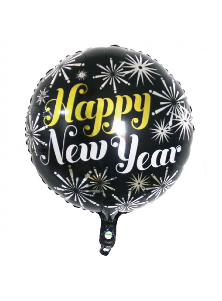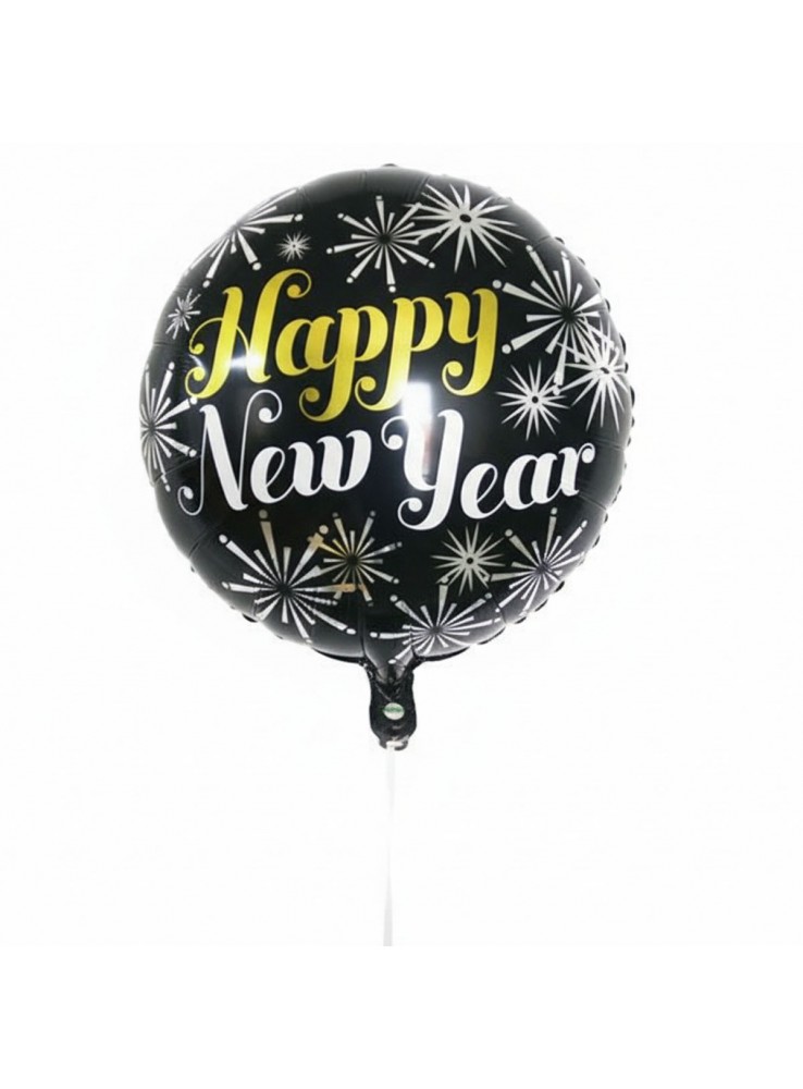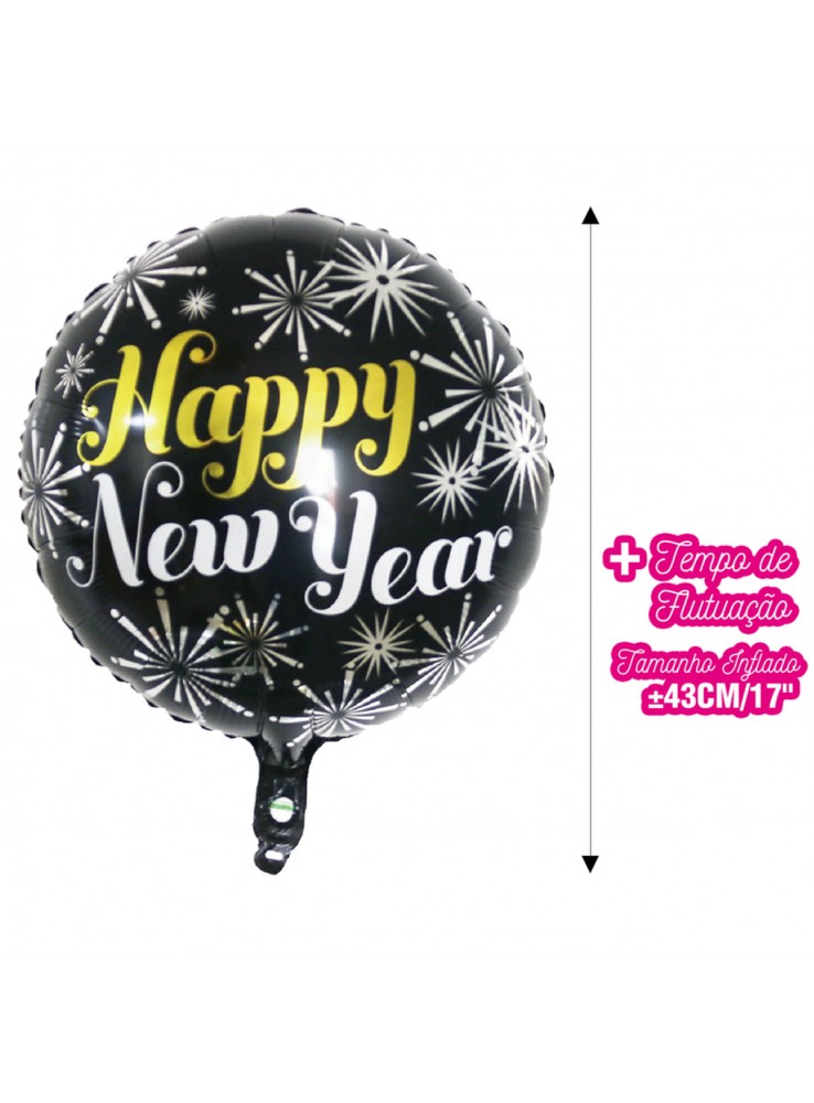 Balão Metalizado no formato redondo com a escrita Happy New Year e a estampa de fogos de artifício.
