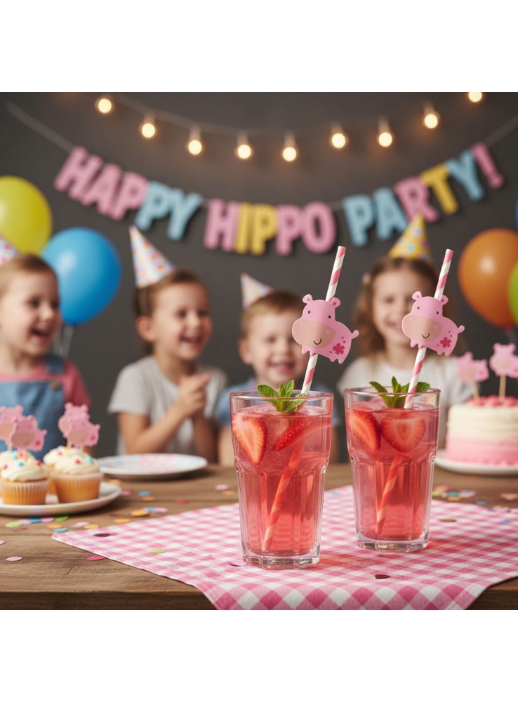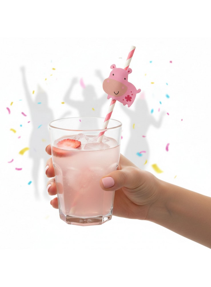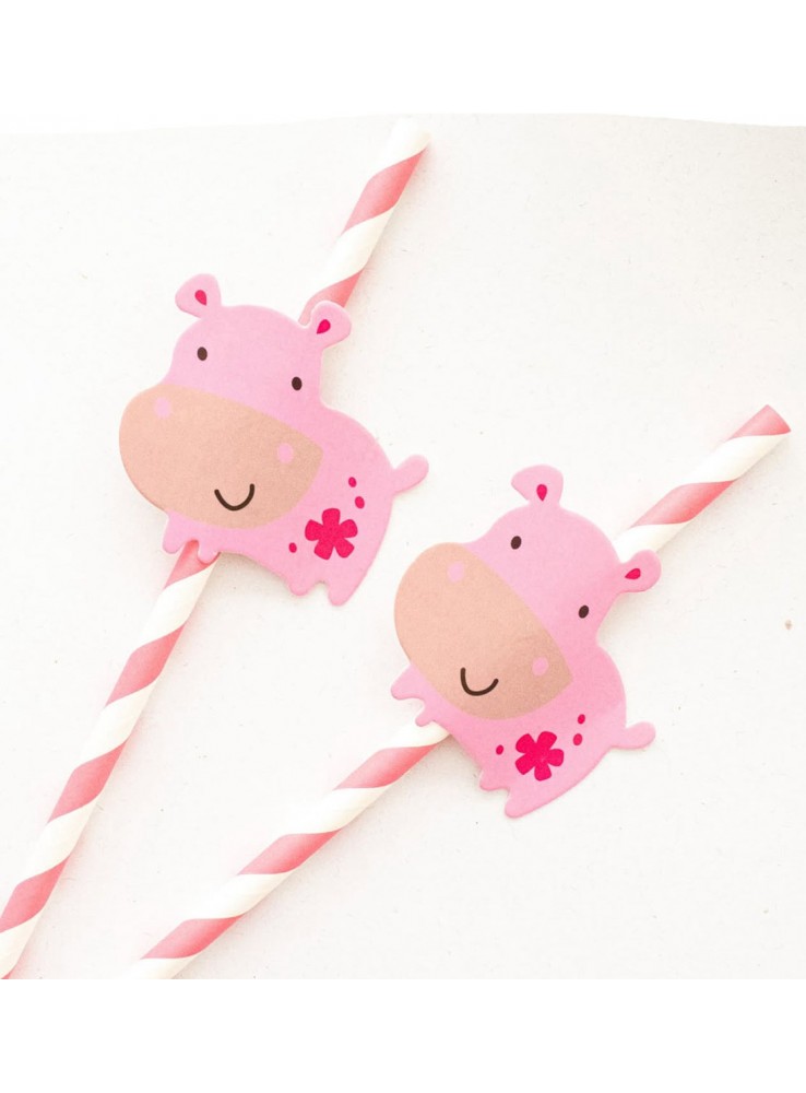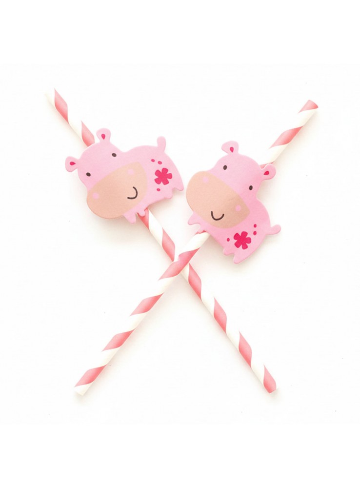 Canudo de Papel listras Rosa com aplique do Animal Hipopótamo.