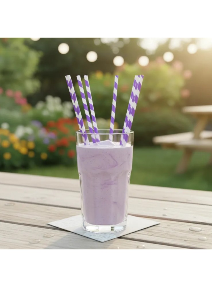 Canudos de Papel Listrados nos tons Roxo e Branco.