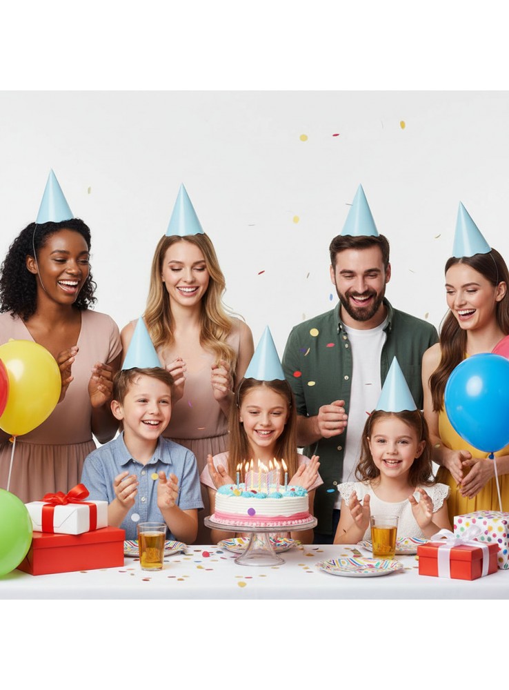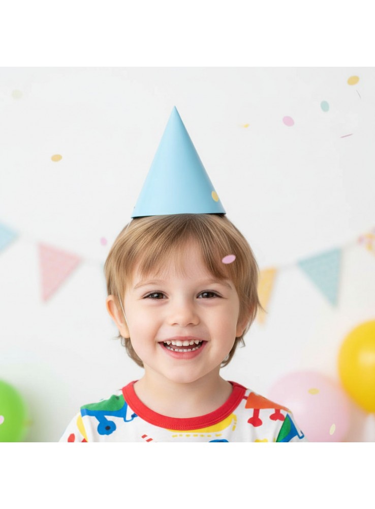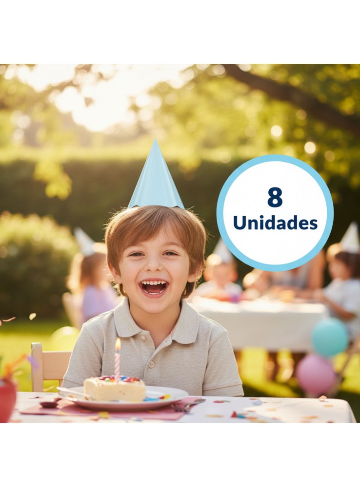 Chapéu de aniversário em papel cartonado ilustrado na cor Azul Claro. A embalagem do chapéu de Aniversário Azul Claro contém 08 unidades e é ideal para presentear os seus amigos e fazer da Hora do Parabéns um momento muito mais divertido.
