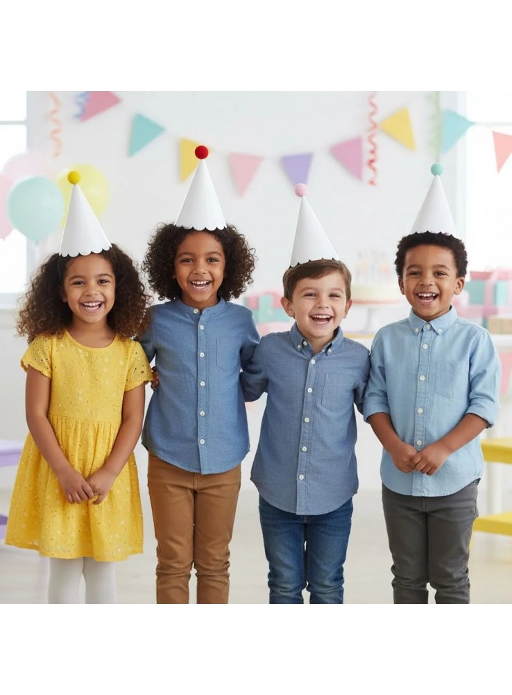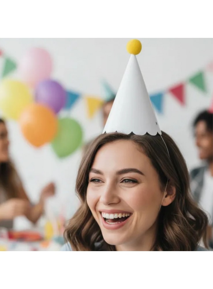 Chapéu de Aniversário Chapeuzinho na estampa Branco com Pompom Multicolorido.