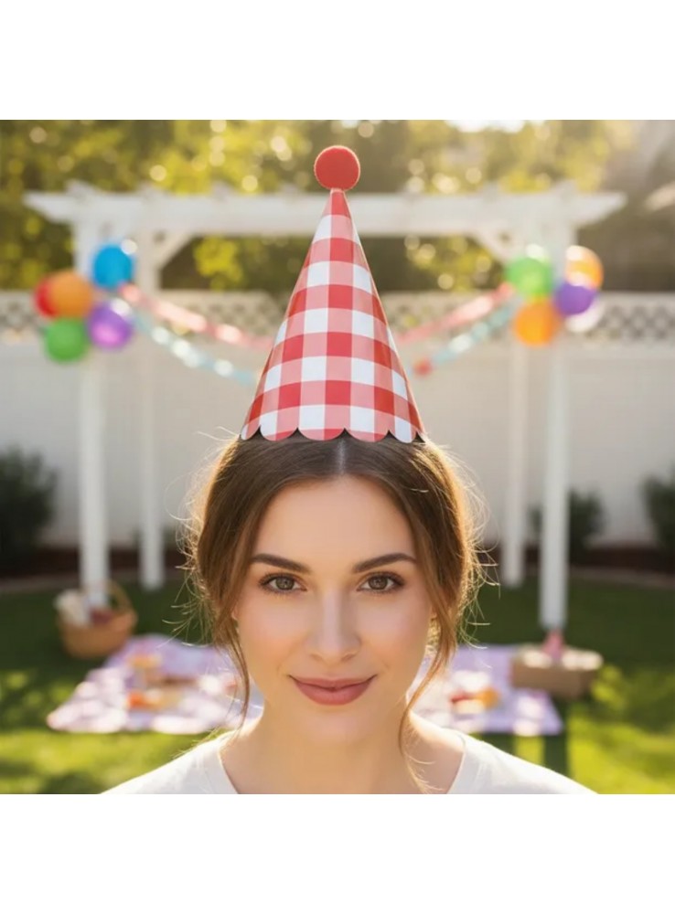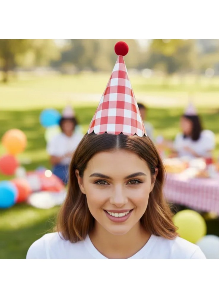 Chapéu de Aniversário Chapeuzinho na estampa Xadrez Vermelho.