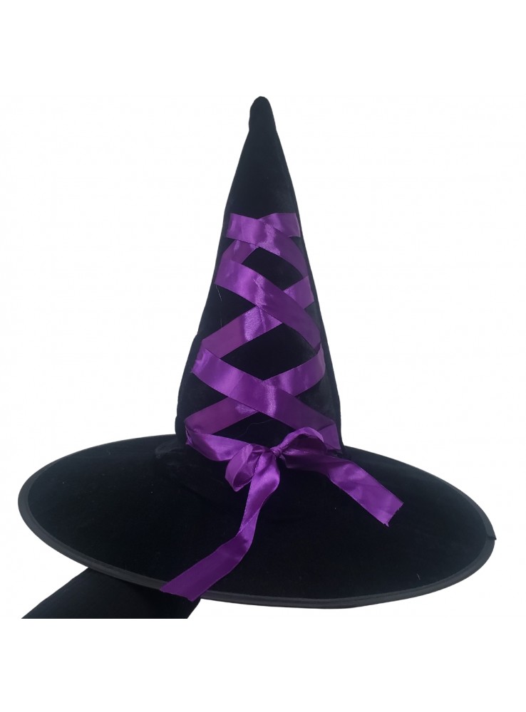 Chapéu de Bruxa Veludo Preto com Laço de Cetim Roxo