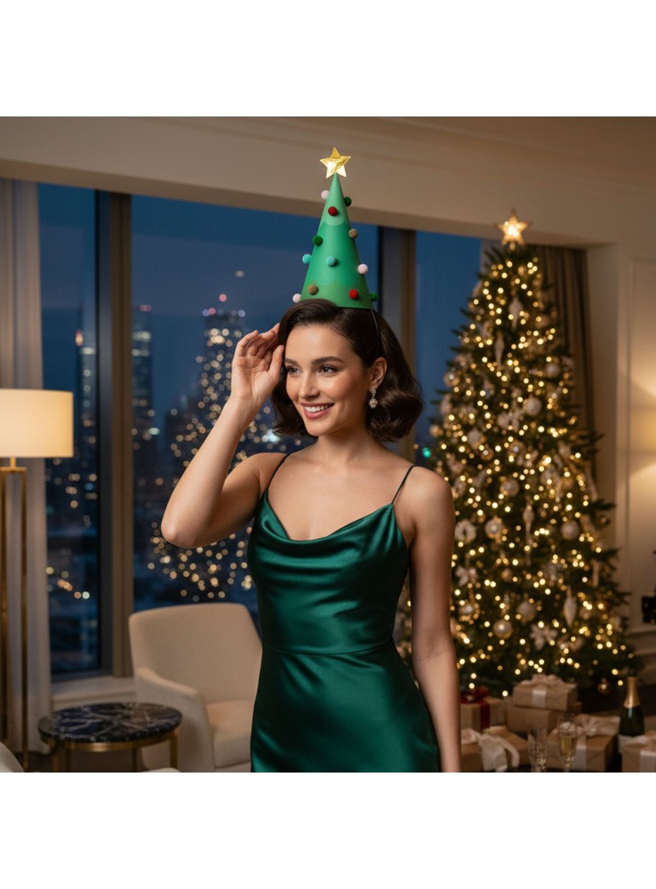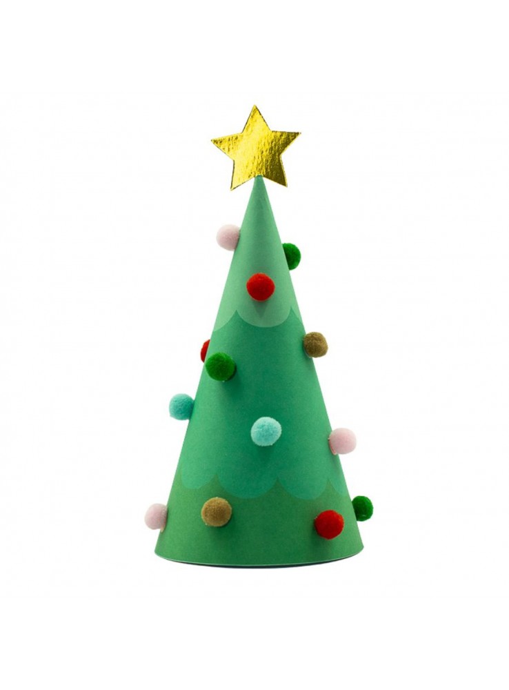 Chapeuzinho de Festa no formato de uma Árvore de Natal com Pompons.
