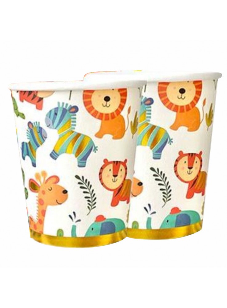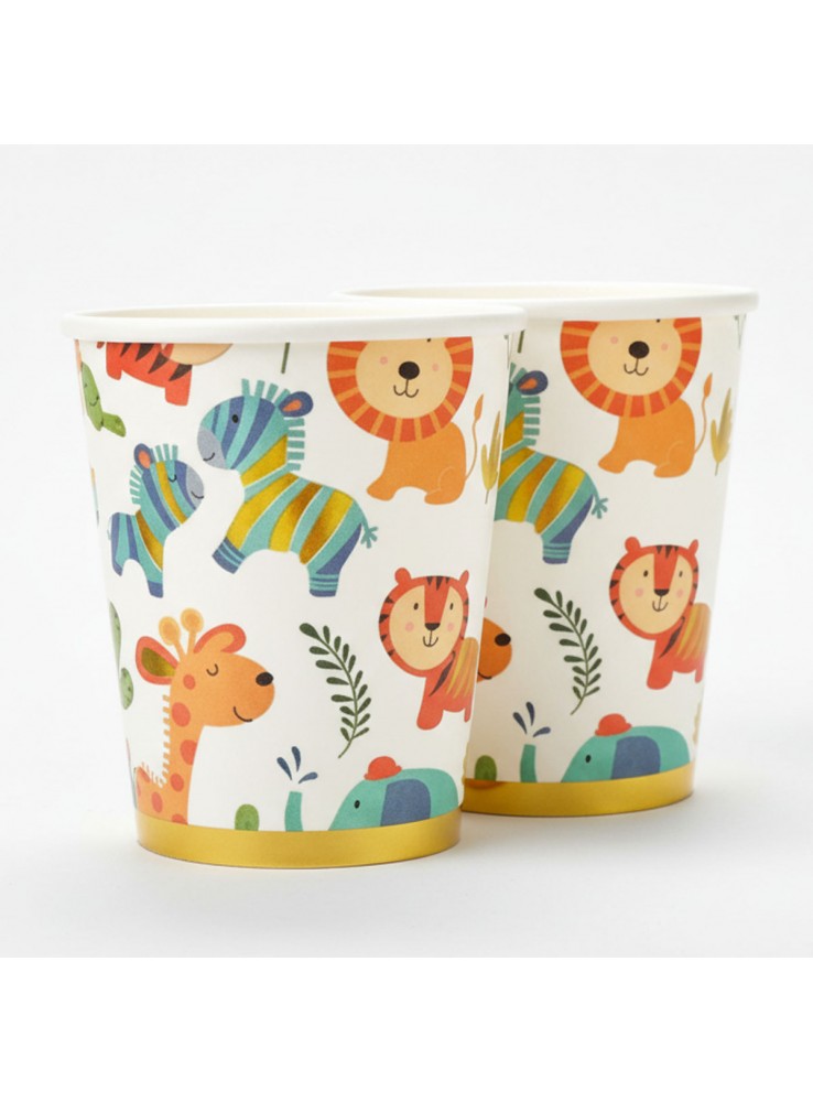 Copos de Papel com a estampa de Animais Safari Coloridos e detalhes em dourado metalizado.