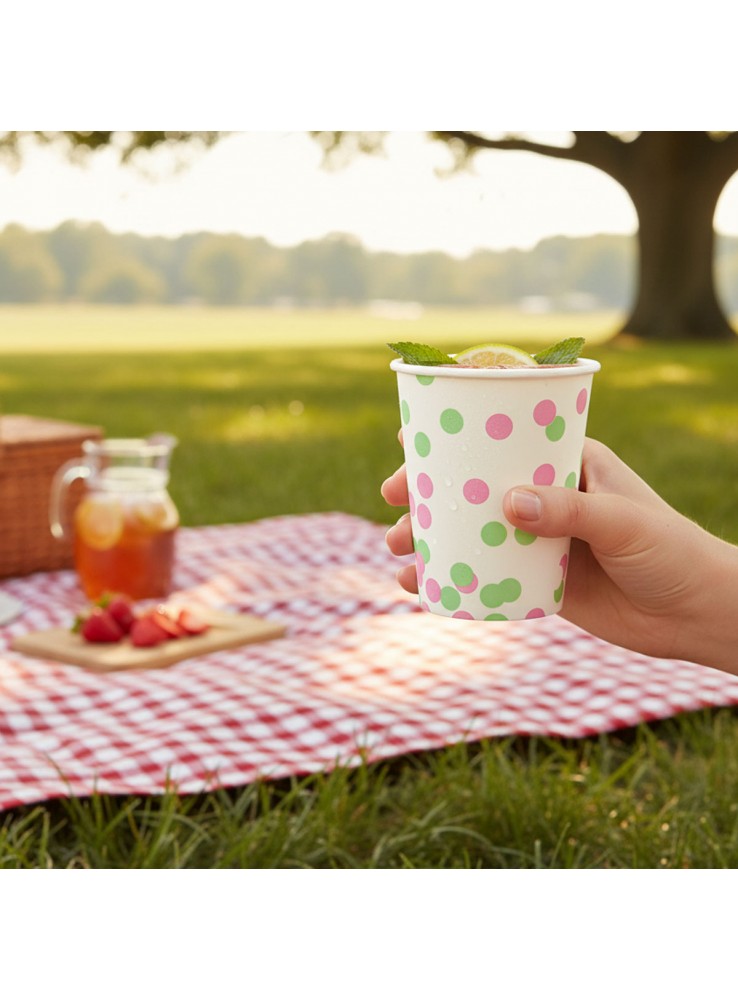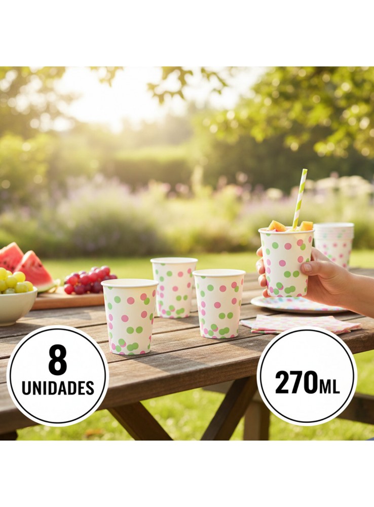 Copos de Papel com a estampa de Bolinhas Rosa e Verde.