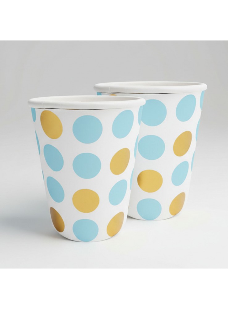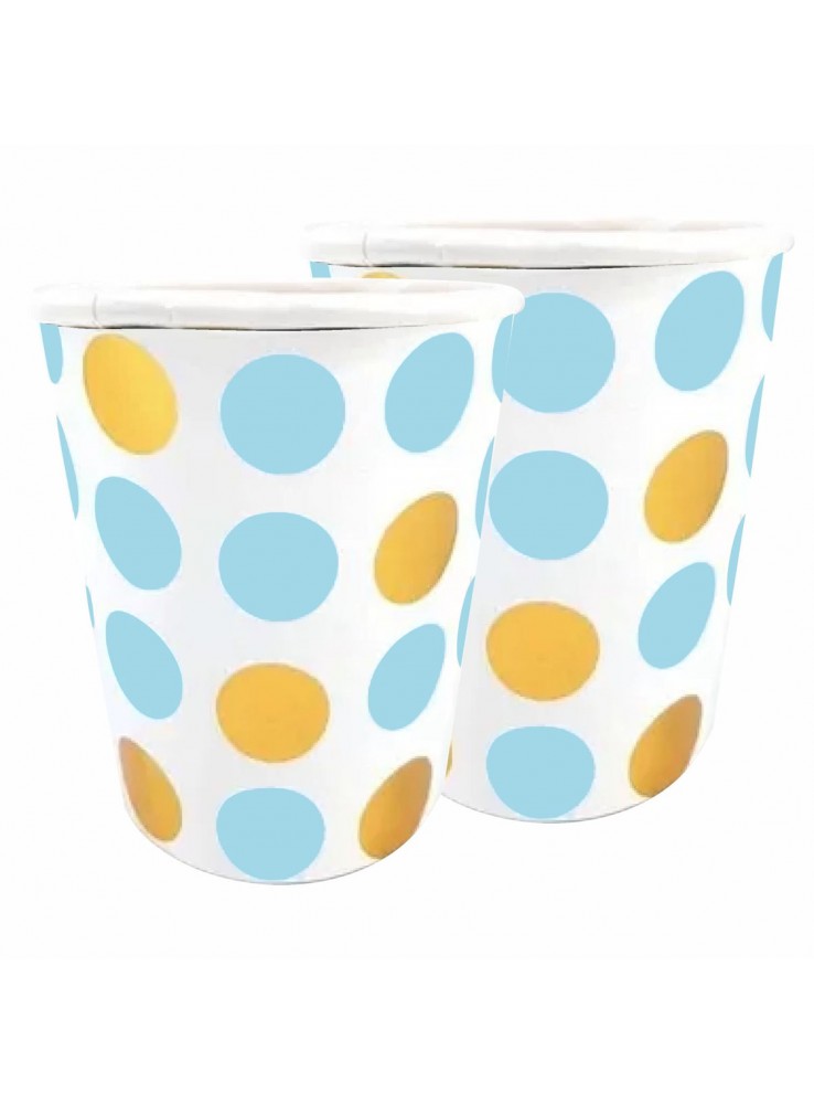 Copos de Papel na estampa Poá Grande nas cores Azul e Dourado.