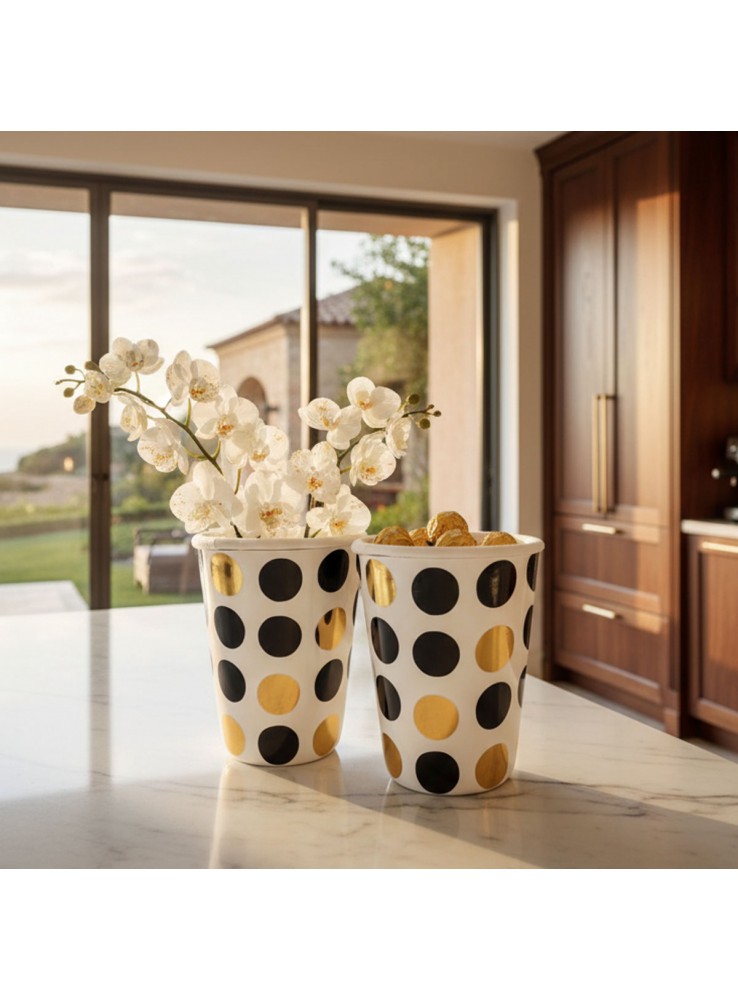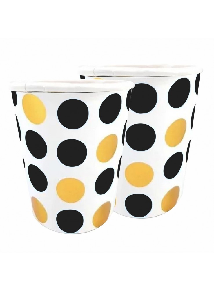 Copos de Papel na estampa Poá Grande nas cores Preto e Dourado.