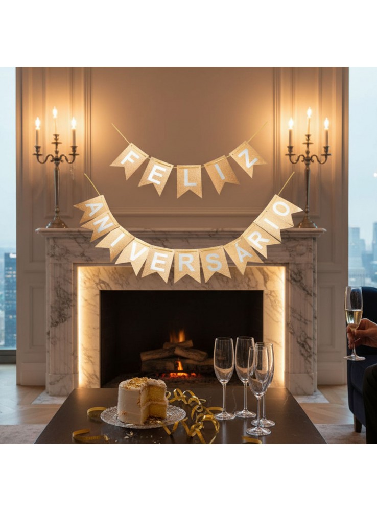 Faixa Decorativa Festa Feliz Aniversário na cor Rose Gold com Glitter.