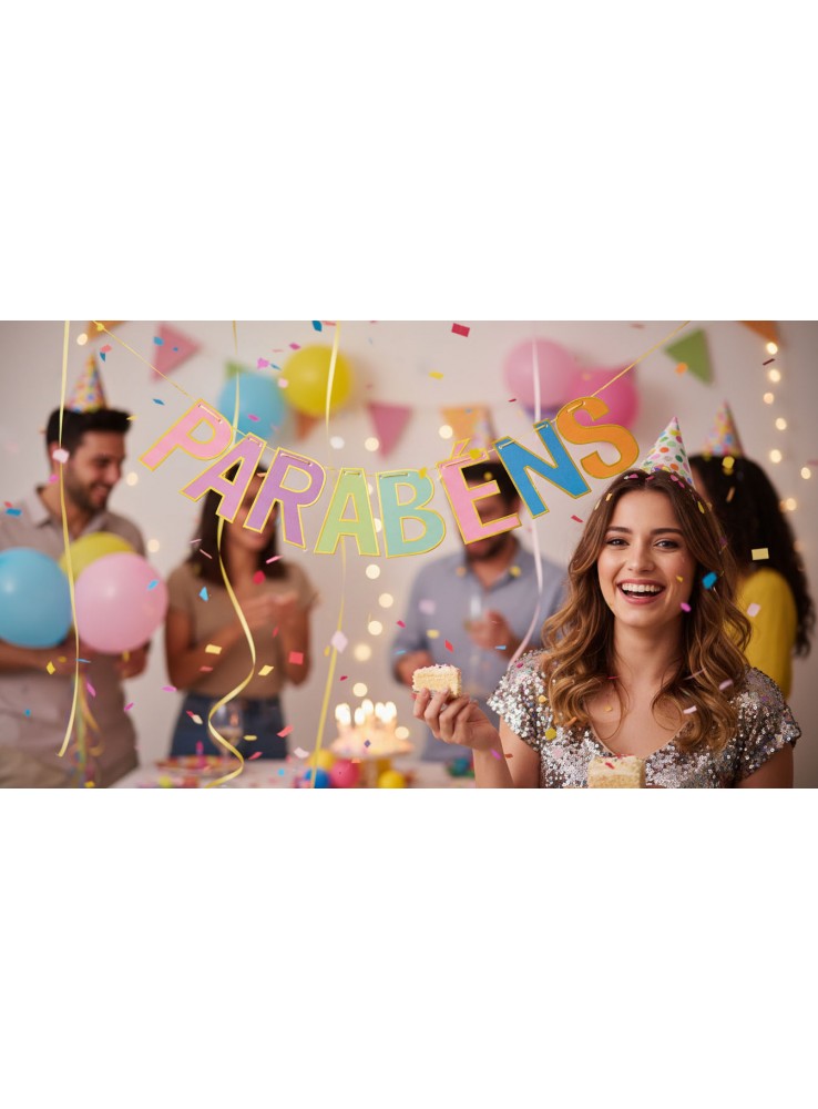 Faixa Decorativa no formato das Letras Parabéns em tons Coloridos.