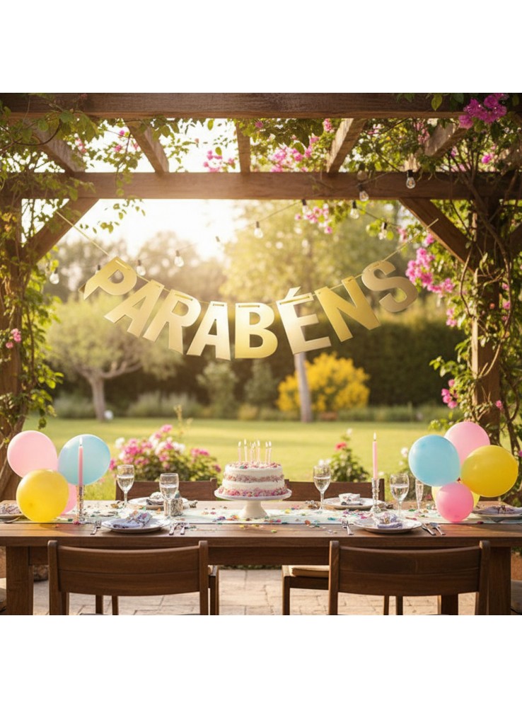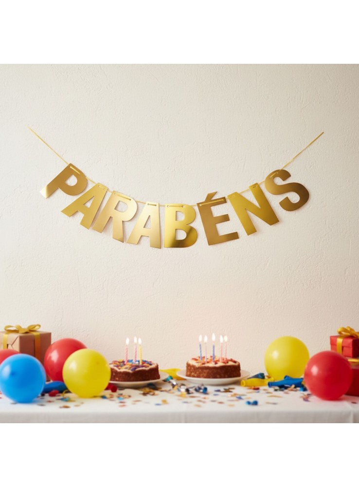 Faixa Decorativa no formato das Letras Parabéns na cor Dourada.