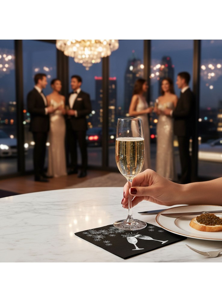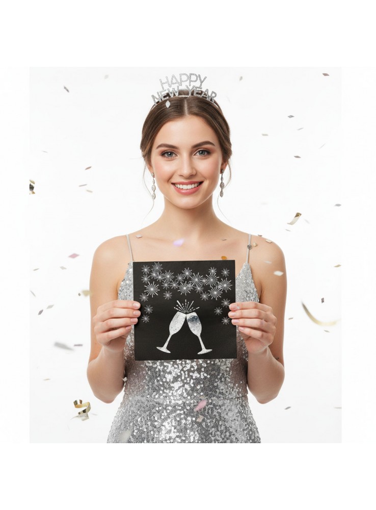 Guardanapos de Papel folha dupla Preto com a estampa de Brinde e Fogos de Artifícios Prata.