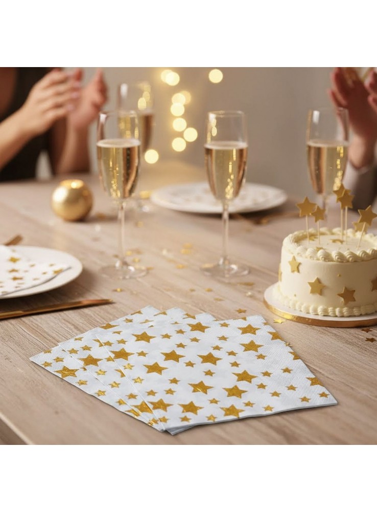 Guardanapos de Papel na cor Branca com estampa de Estrelas Douradas Metalizadas.