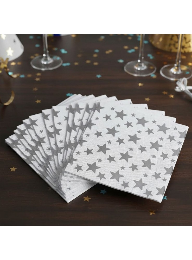Guardanapos de Papel na cor Branca com estampa de Estrelas Pratas Metalizadas.