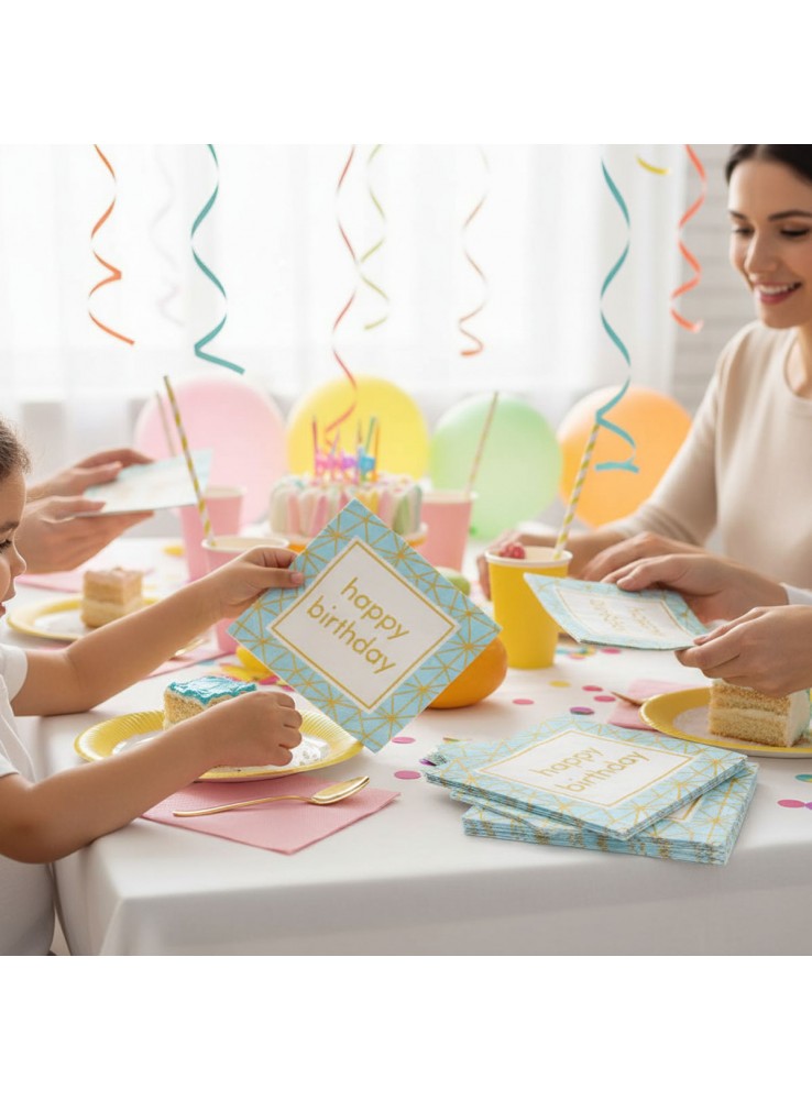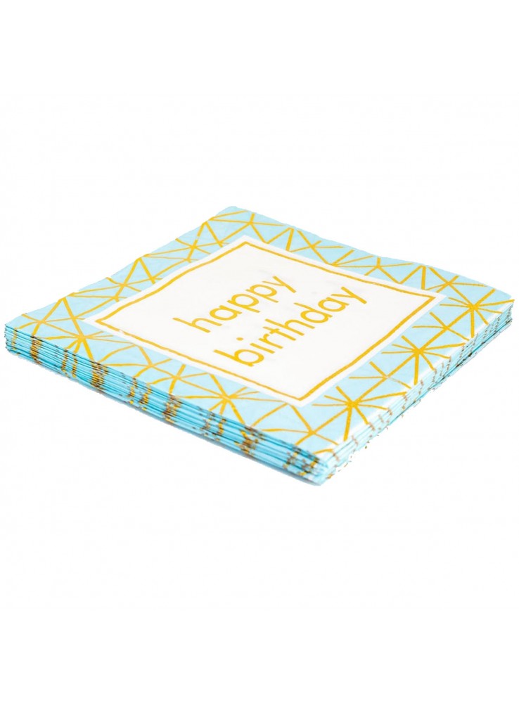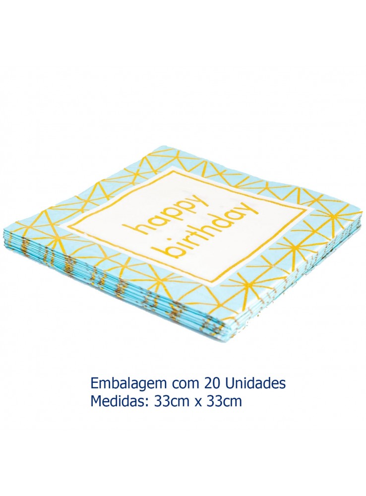 Guardanapo de Papel quadrado Azul com a escrita Happy Birthday dourado metalizado.