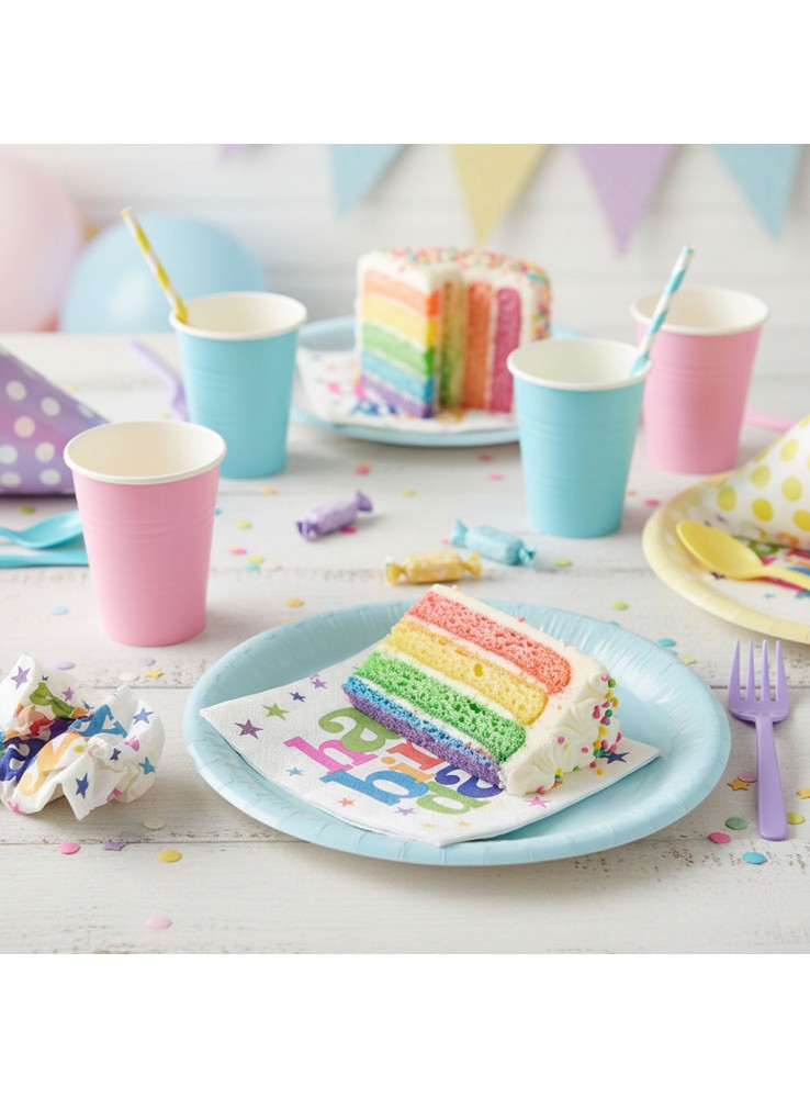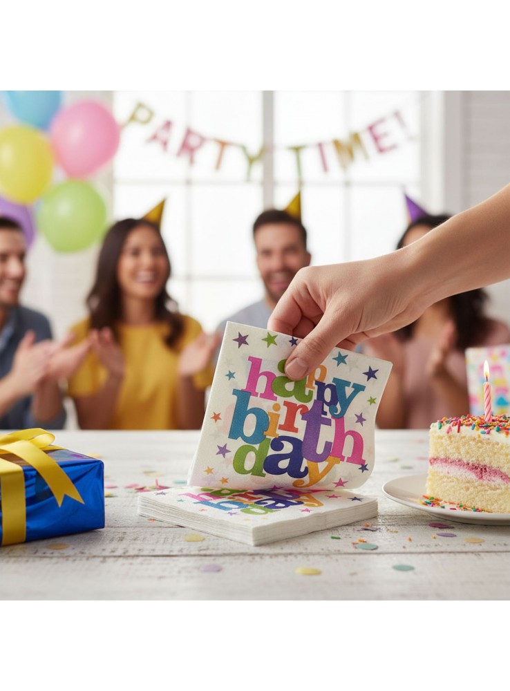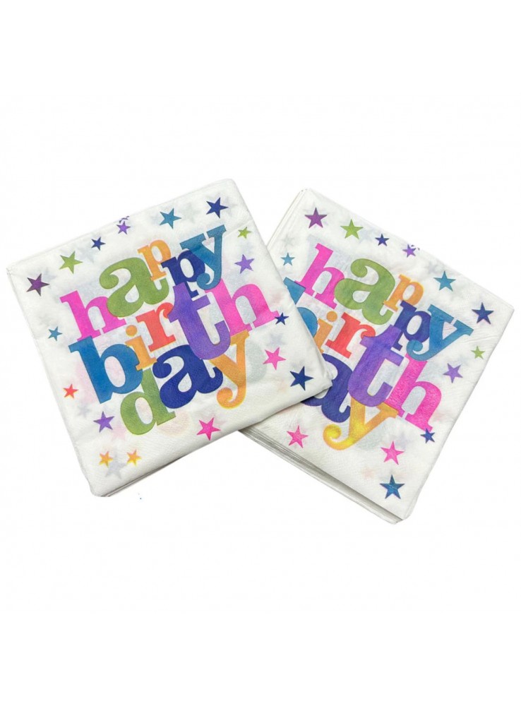 Guardanapo de Papel quadrado Branco com a escrita Happy Birthday Colorido.