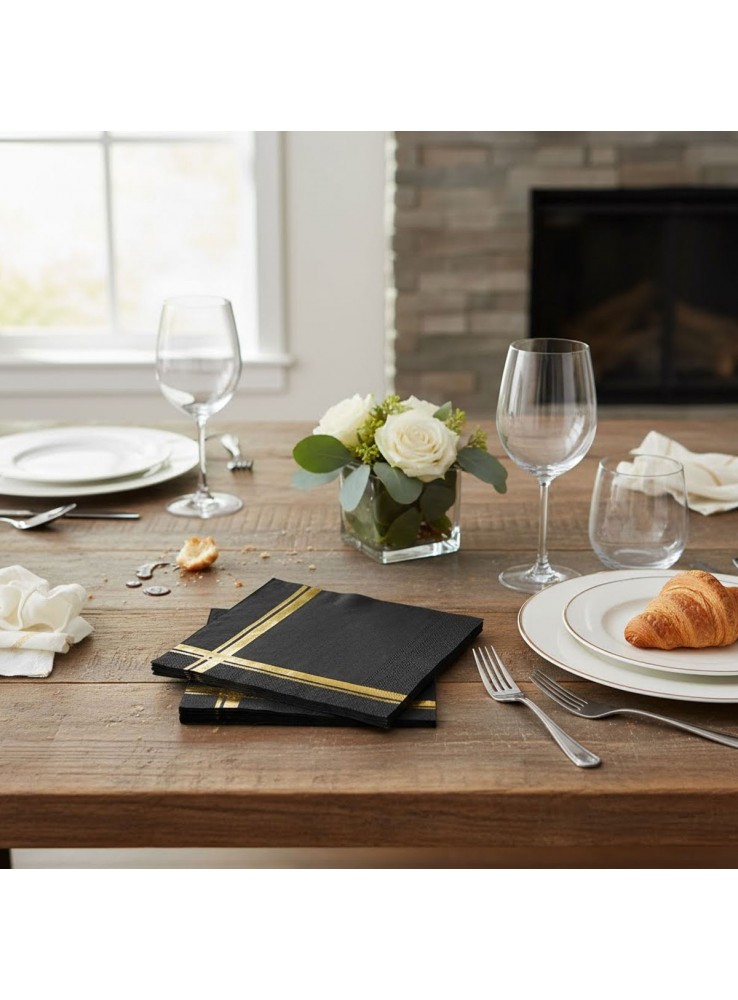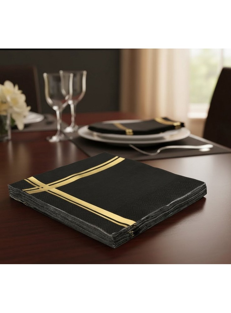 Guardanapos de Papel na cor Preta com a estampa de Listras Dourada.