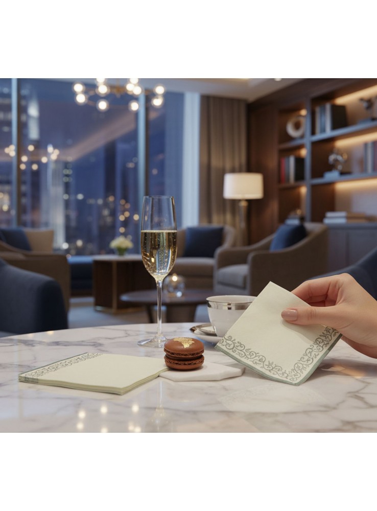 Guardanapo de Papel Luxo folha tripla Branco com o desenho Arabesco e Borda Prata.