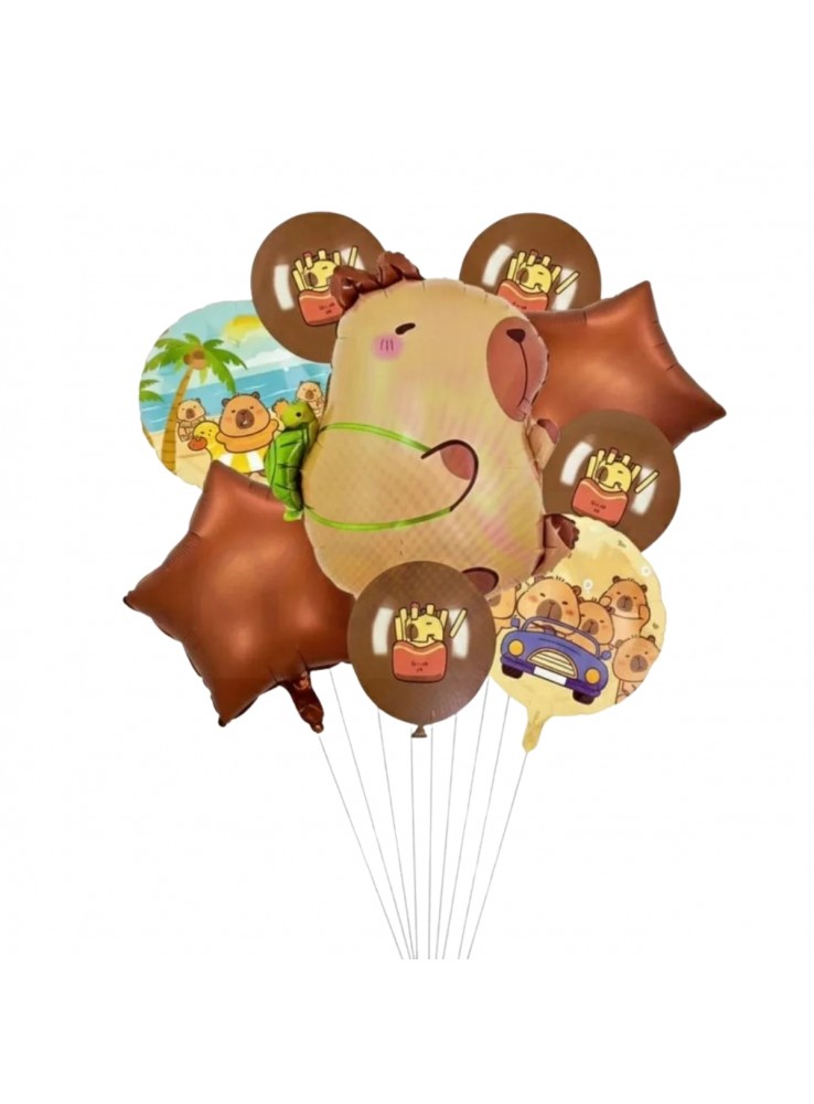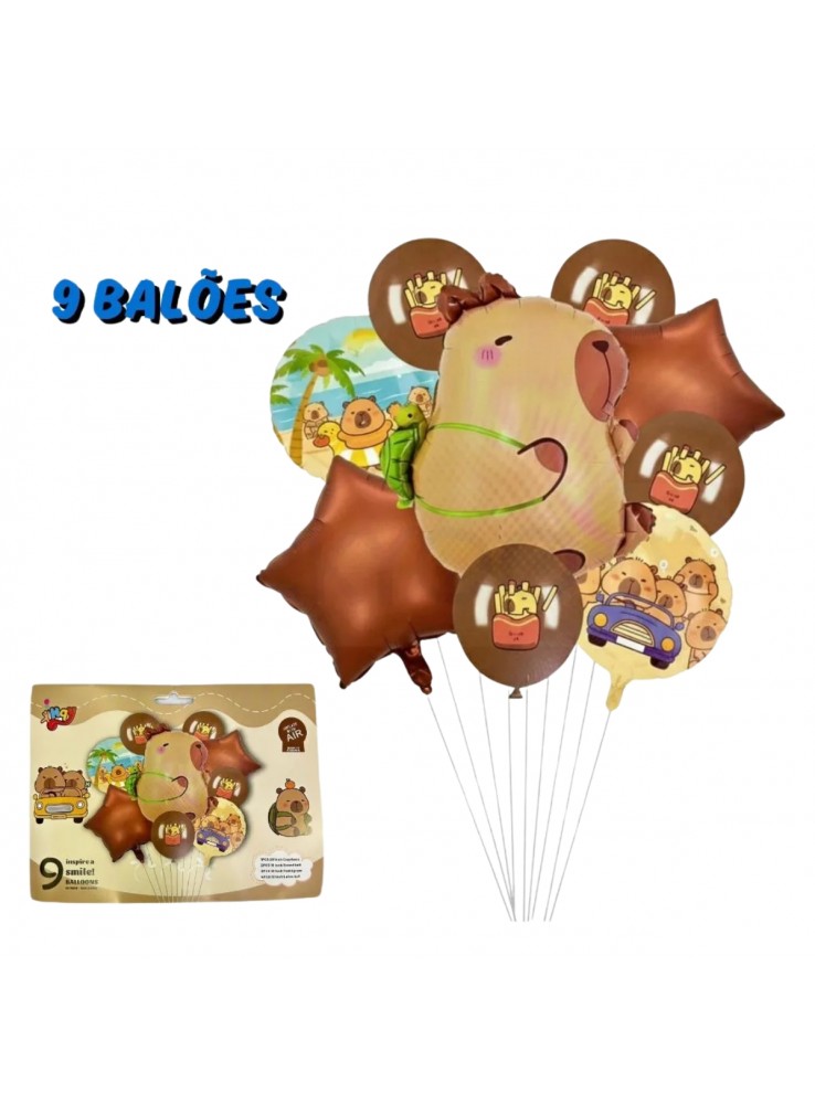 - Inclui balão central em formato de capivara e balões redondos e em estrela.