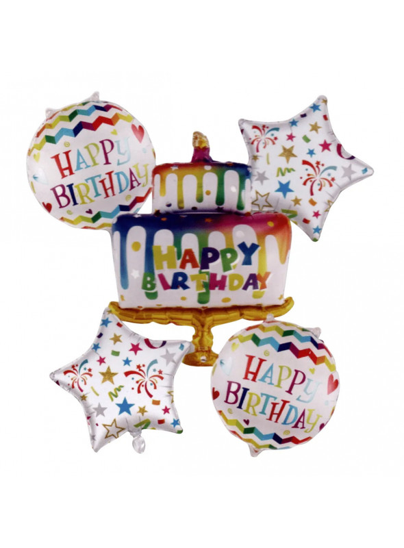 Kit Balões Metalizados no tema Happy Birthday Feliz Aniversário Bolo.