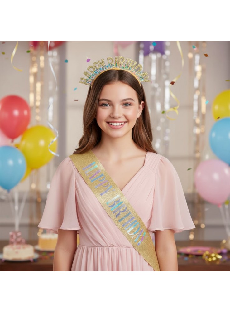 Kit Happy Birthday Adereço de Festa Tiara e Faixa na cor Dourado com Glitter.
