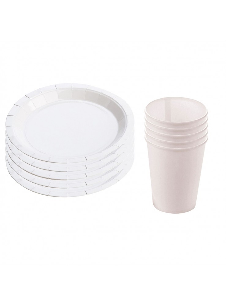 Pratos e Copos Descartáveis de Festa de Papel na cor Branca.
