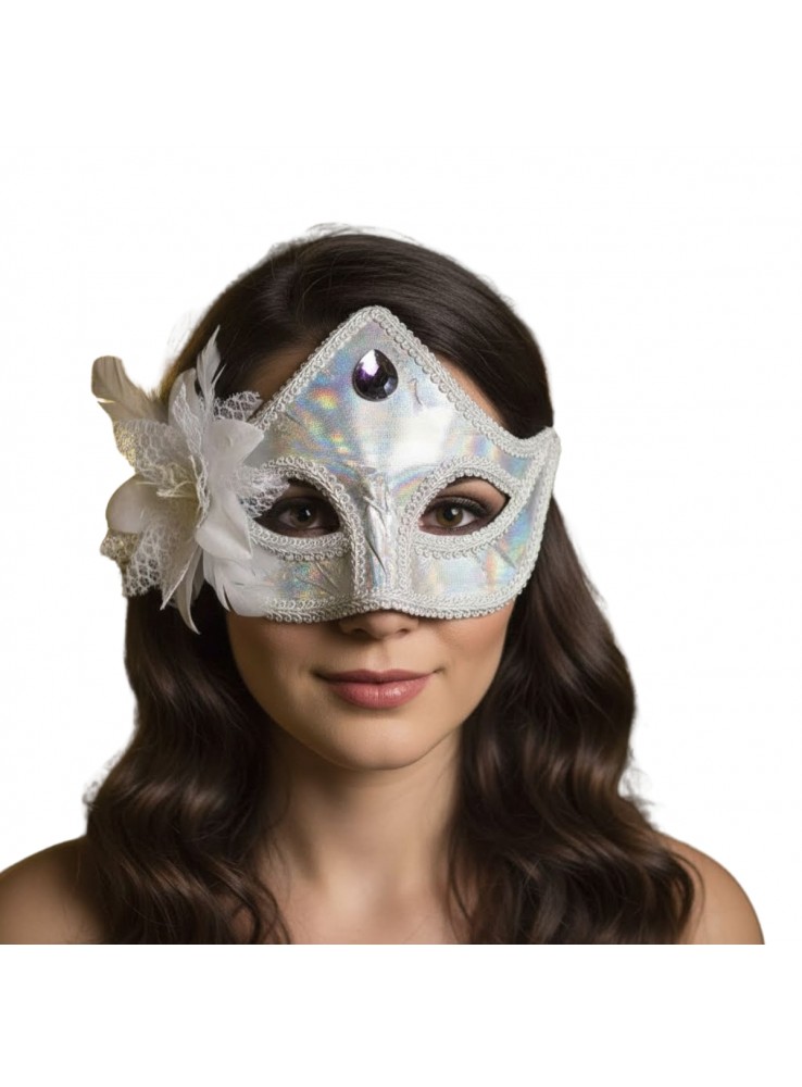 Máscara de Festa Branca Metalizada com aplicação de uma Flor.