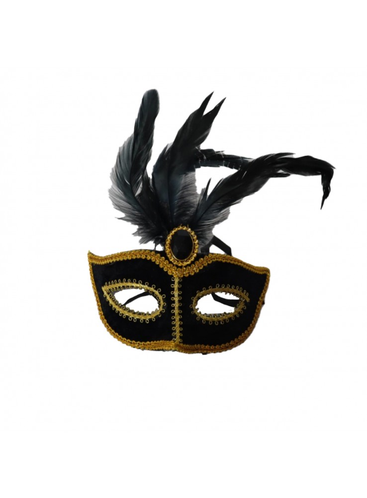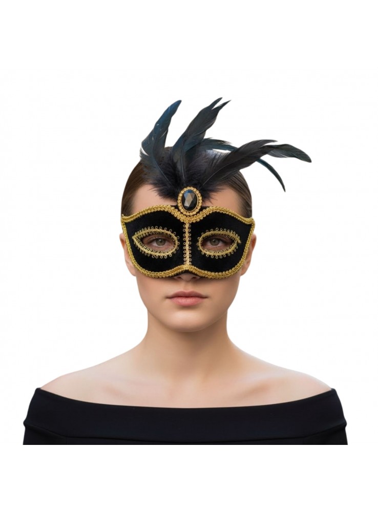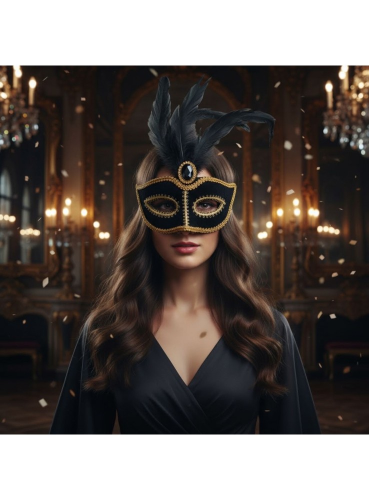 Máscara Encanto preta com penas e detalhes dourados, perfeita para quem busca elegância e um toque de audácia.