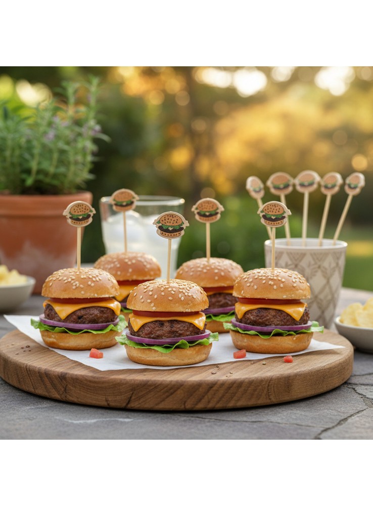 Palitos de Bambu para Petiscos com Hambúrguer na topo.
