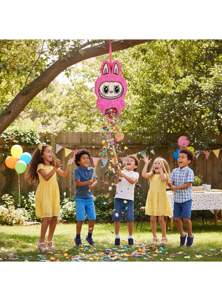 A Pinhata Labubu Rosa suporta 3kg de doces, brinquedos, confetes.