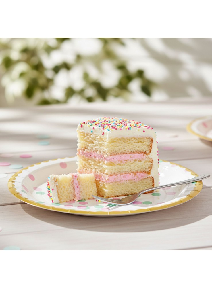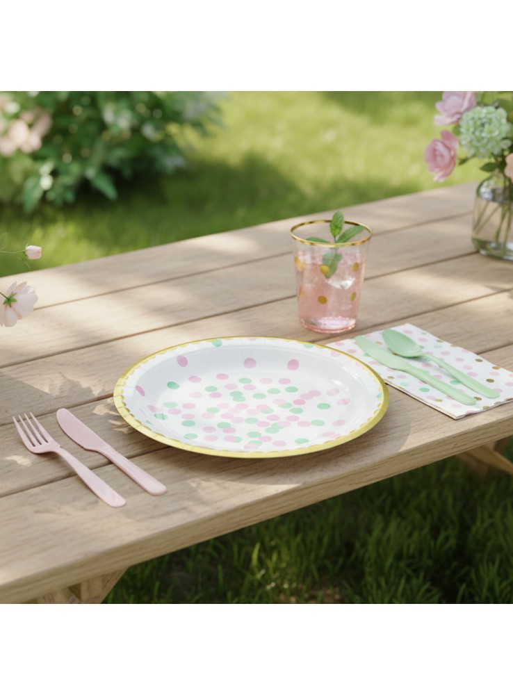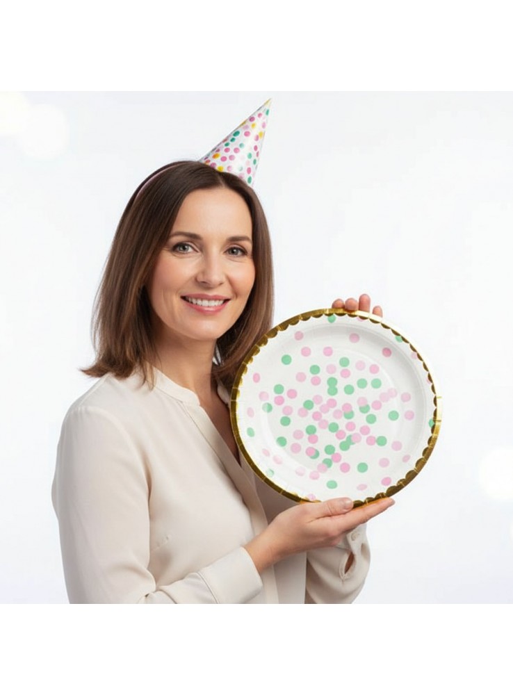 Prato de Papel no formato redondo branco com a estampa de Bolinhas Rosa e Verde e a borda dourada metalizada.