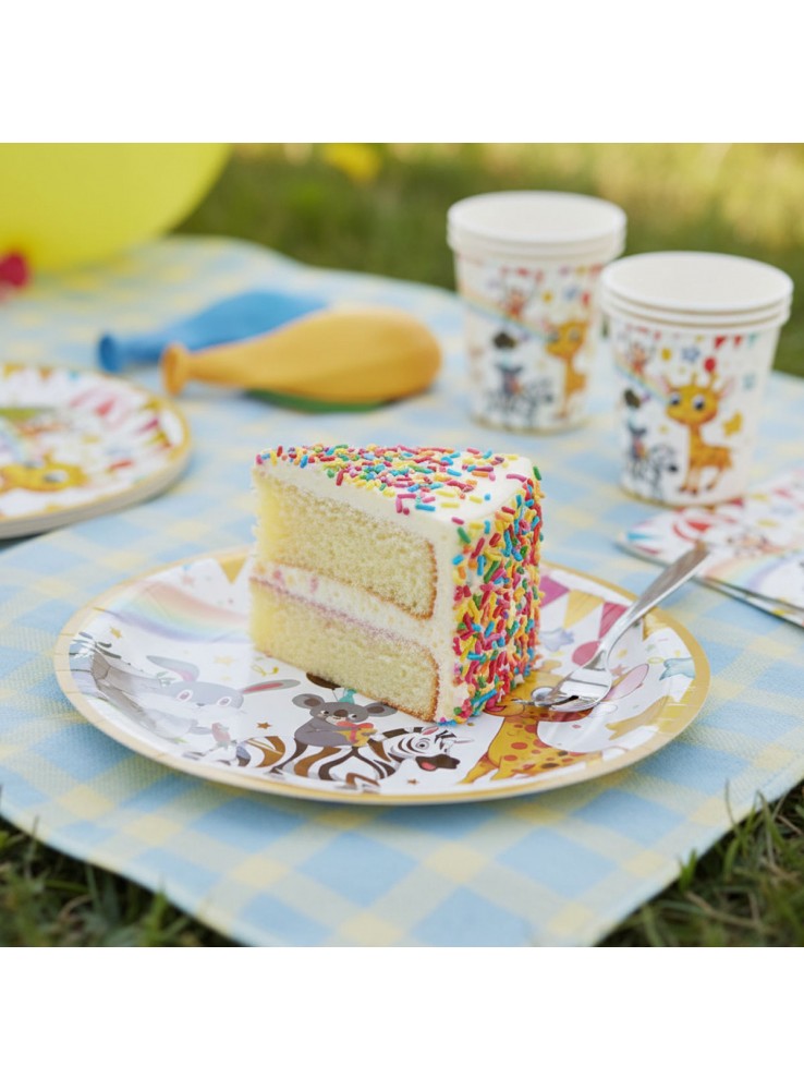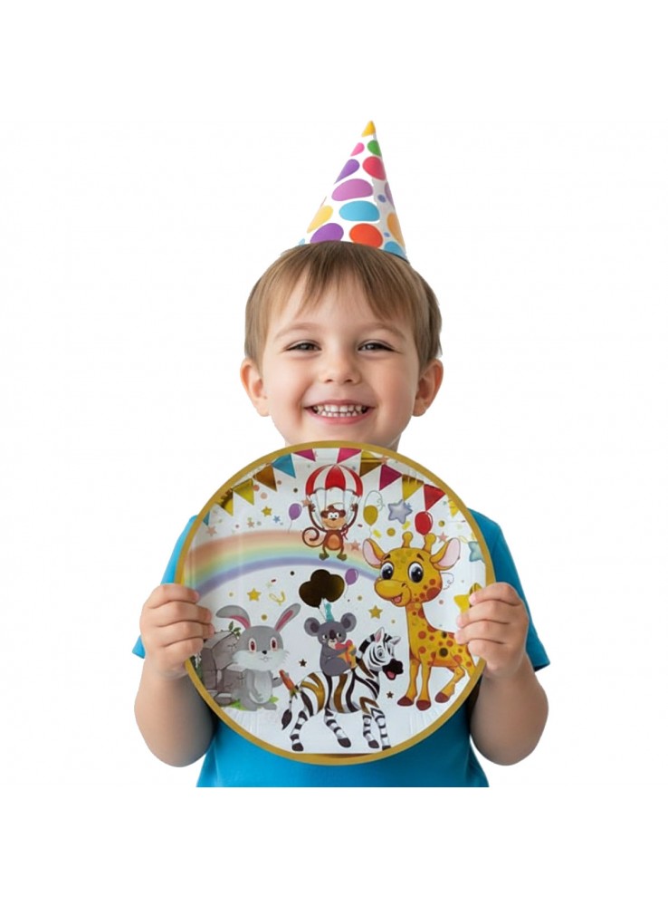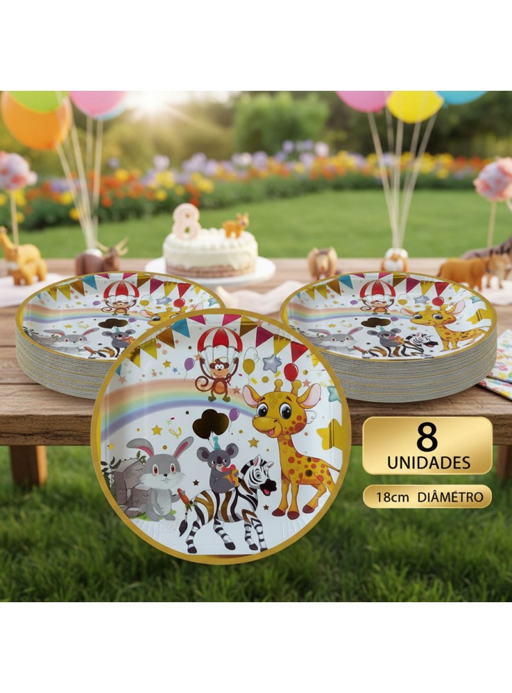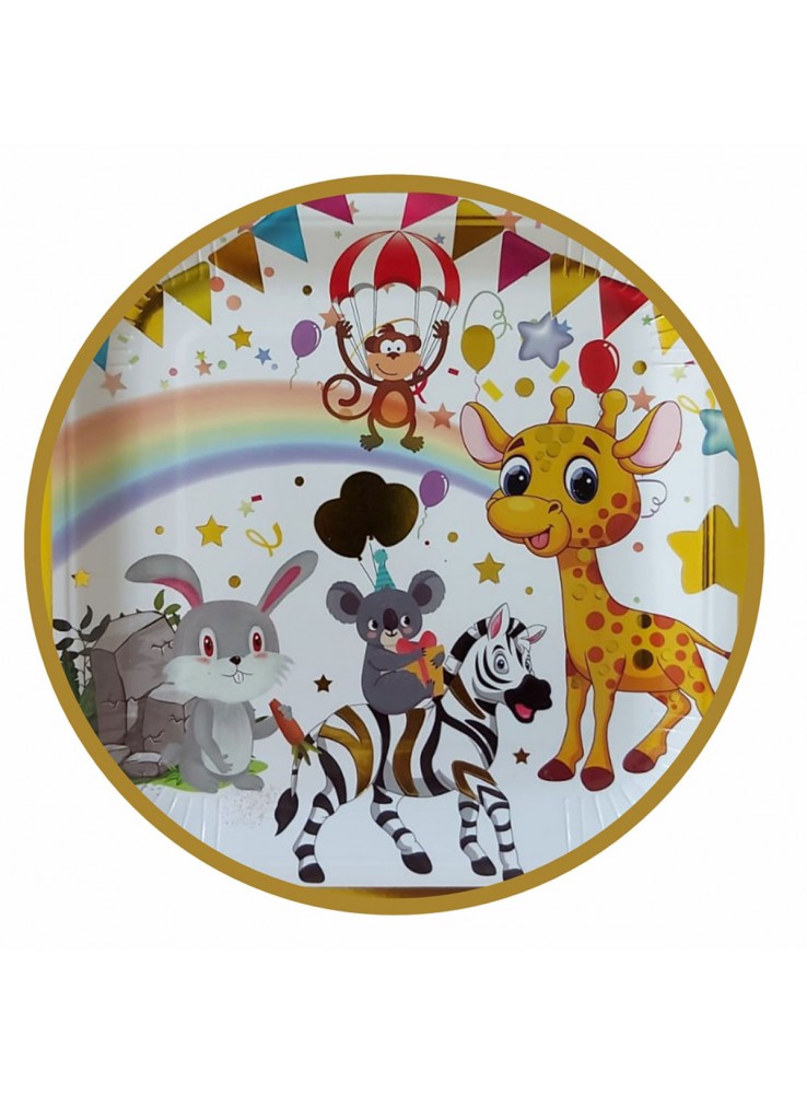 Prato de Papel no formato redondo com a estampa de Animais e a borda dourada metalizada.