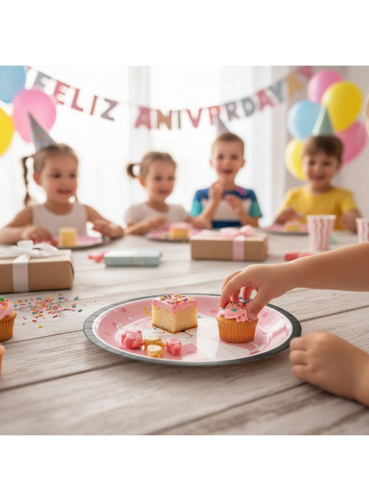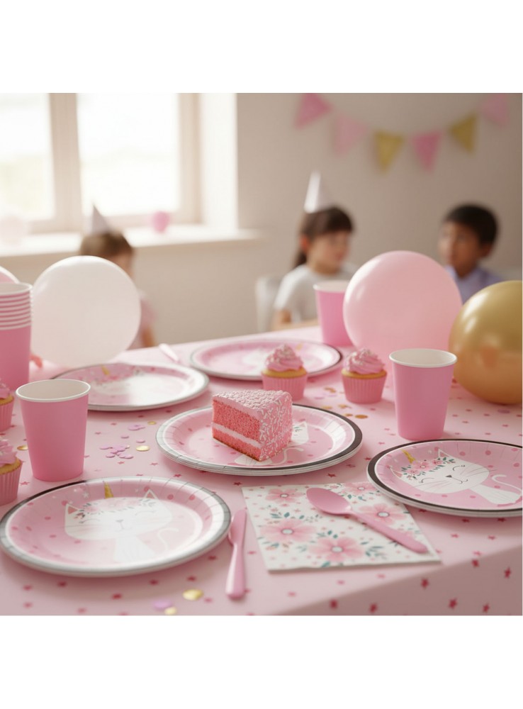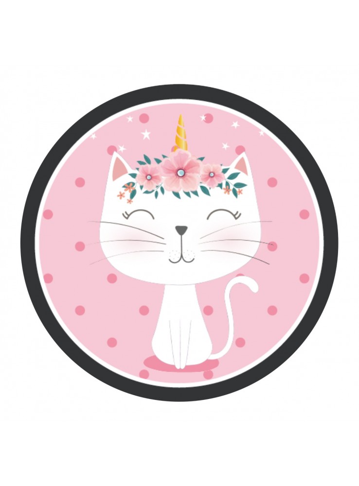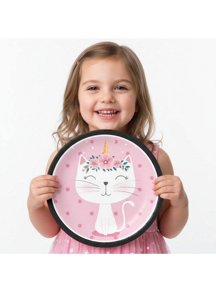 Prato de Papel no formato redondo rosa com a estampa de uma Gatinha.