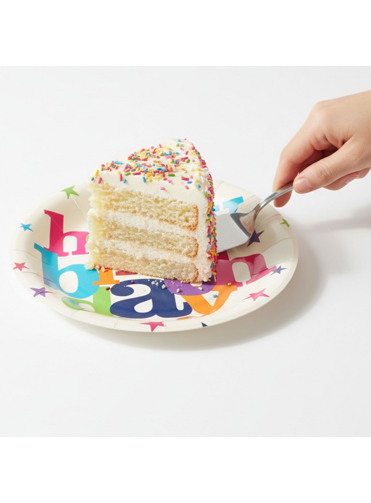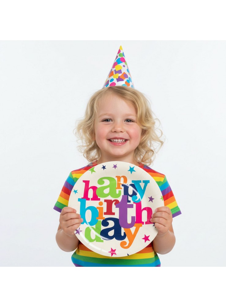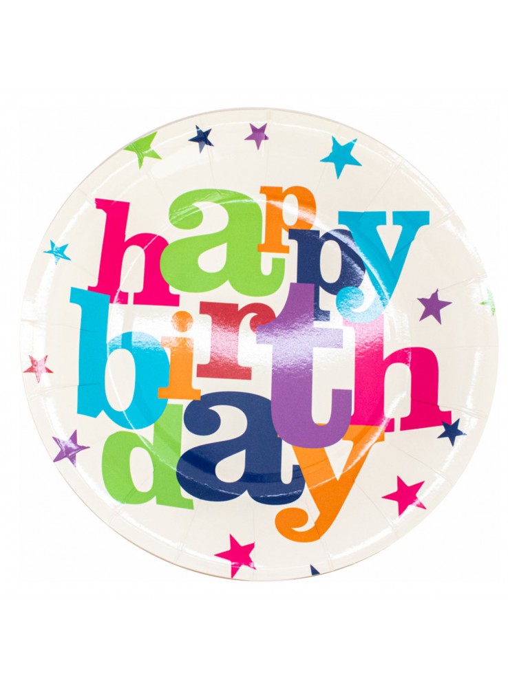 Prato de Papel no formato redondo com a escrita Happy Birthday Colorida.