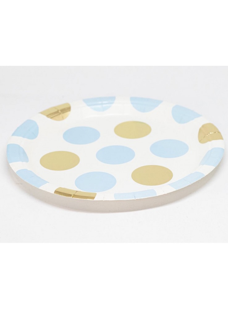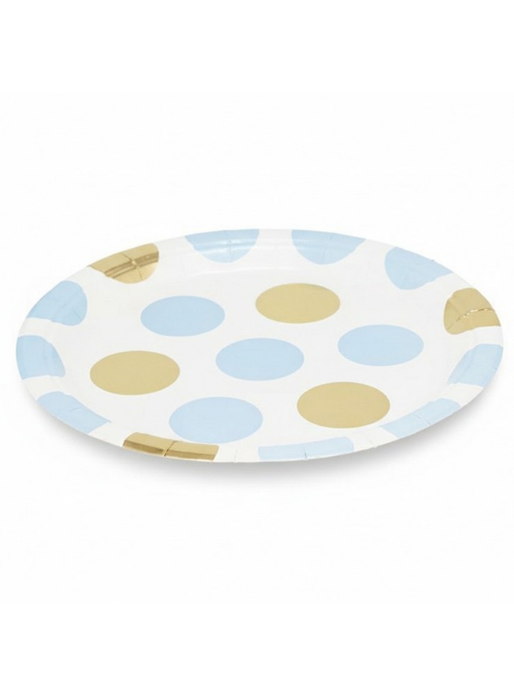 Prato de Papel redondo com a estampa de Poá Grande nas cores Azul e Dourado.