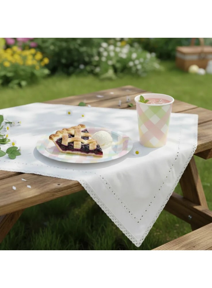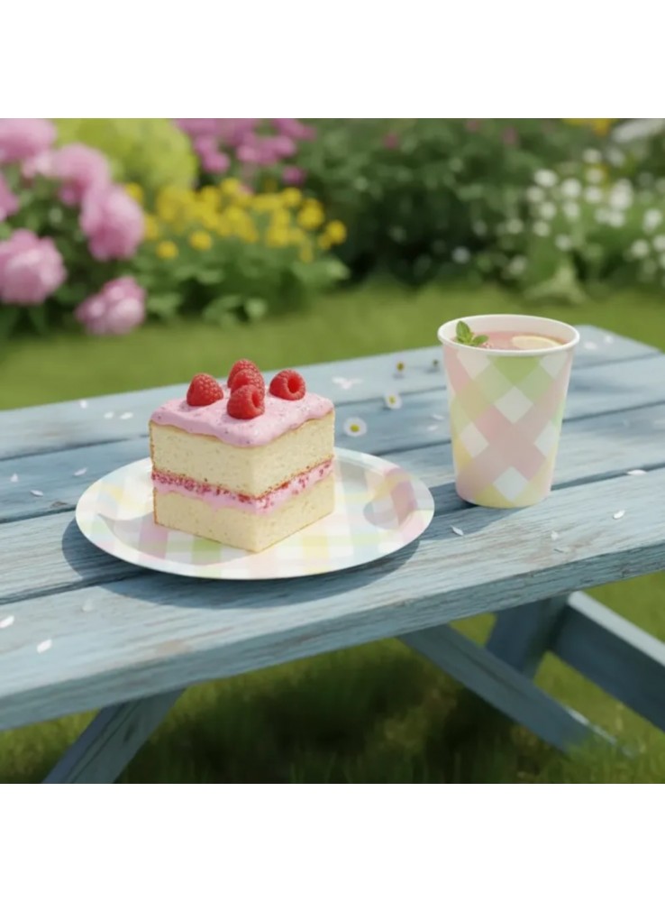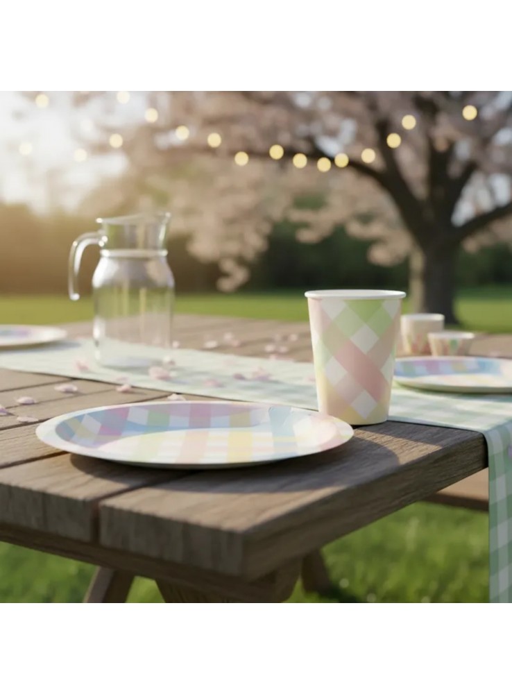 Prato e Copo de Papel na estampa Xadrez Colorido Candy Colors Pastel.
