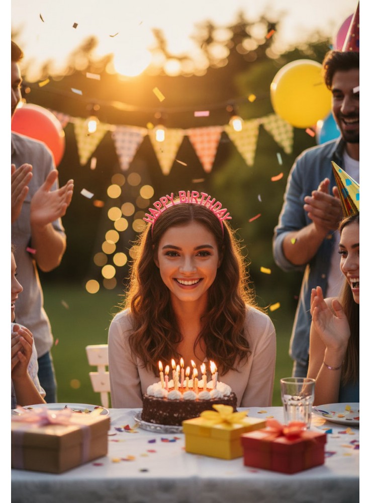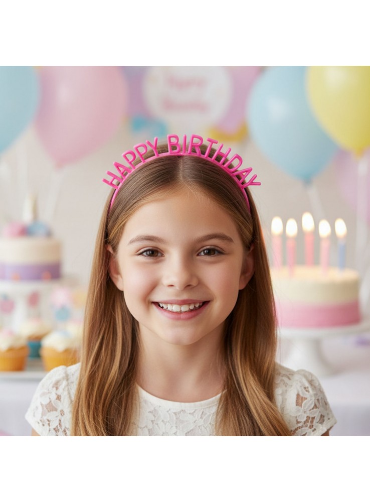 Tiara de Plástico Happy Birthday na cor Rosa Pink.