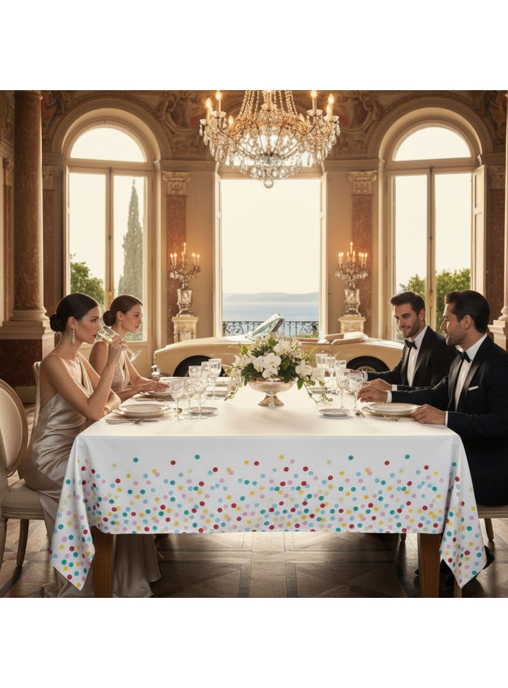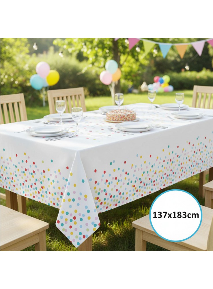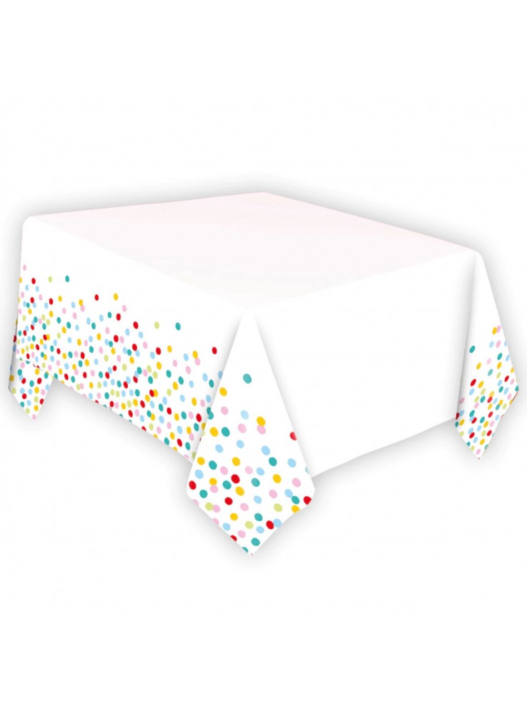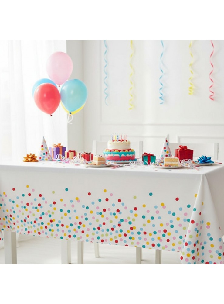 Toalha de Mesa Retangular na cor branca com a estampa de Bolinhas Coloridas.