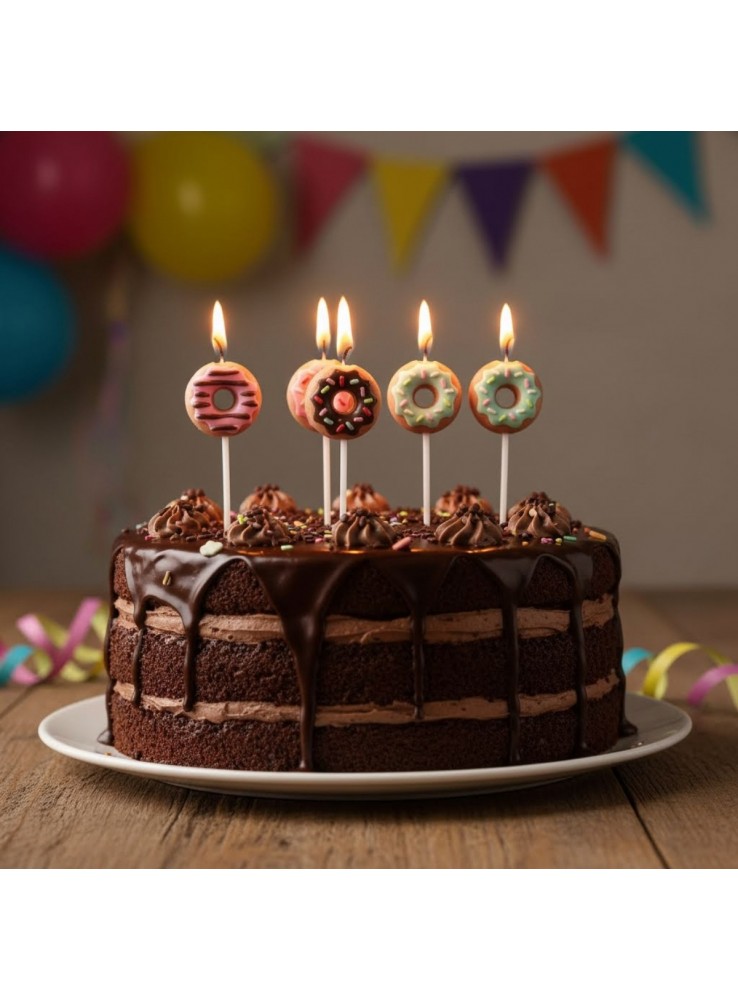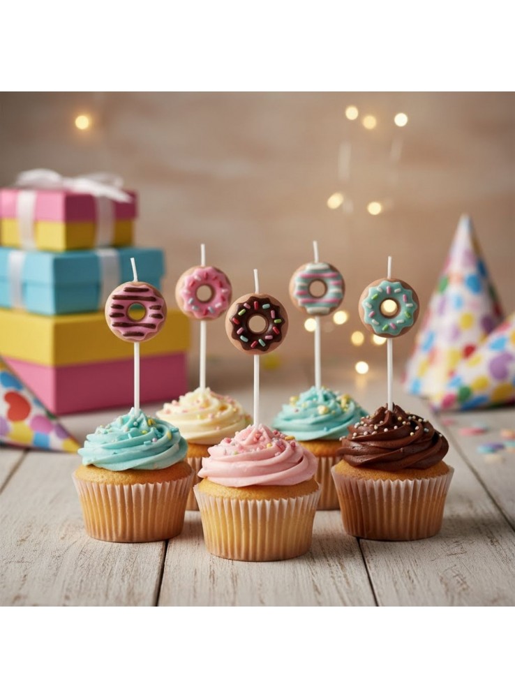 Este kit de velas decorativas em formato de donuts é perfeito para festas de aniversário, tornando o bolo ainda mais especial e colorido.