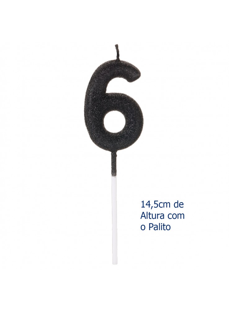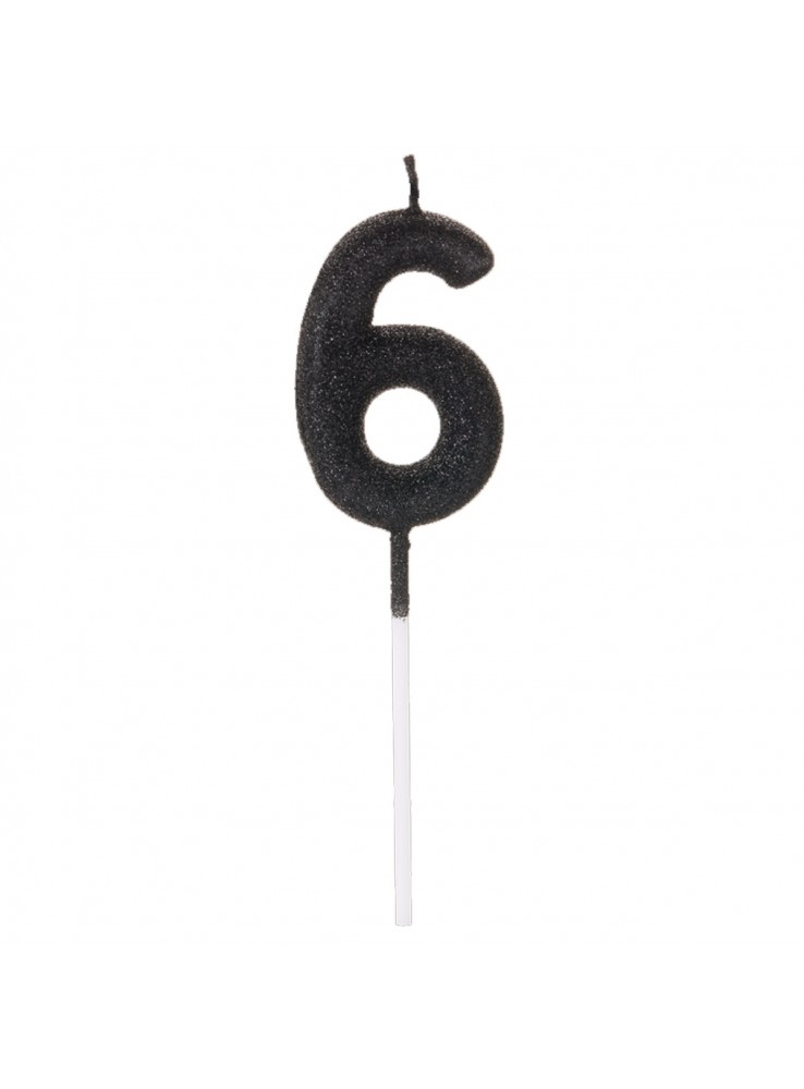Vela de Aniversário no formato do Número 6 com Glitter Preto.